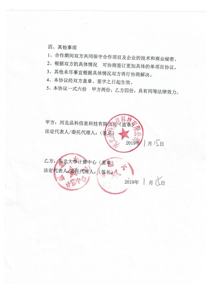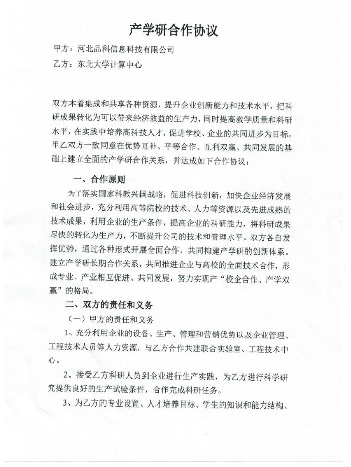 2019年1月15日,河北品科信息科技有限公司與東北大學計算中心成功簽訂“產學研合作協議書”,雙方本著服務企業,滿足產業需求,提高教學質量和科研水平,集成各類資源,提升創新能力為目標,經共同協商,一致同意在互惠互利、共同發展的基礎上建立全面的產學研合作關系,實現優勢互補,合作雙贏,一致同意達成此份協議。此次“產學研合作協議書”的成功簽訂,預示著我司在發展的道路上又前進了一大步。