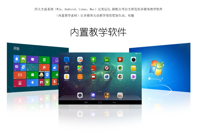 集成了電子白板、平板電視、電腦、投影機、投影幕布、音響、廣告機、WINI等多種功能為一體的互動教學機,從而增強了教學互動性,使教學更簡潔、更簡易、更高效。