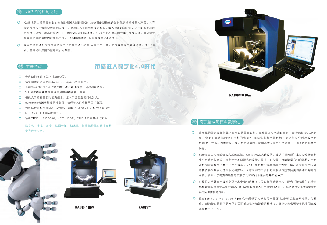 技術參數:3300頁/小時,真空吸附式自動翻頁掃描機器人;掃描臺110度V型22.1兆相機X2