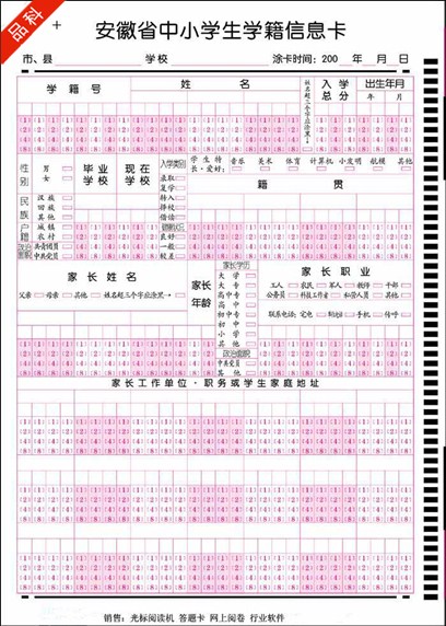 信息卡(又稱(chēng)答題卡)是光標(biāo)閱讀機(jī)輸入信息的載體,是配套光標(biāo)閱讀機(jī)的各種信息錄入表格的總稱(chēng). 信息卡將用戶(hù)需要的信息轉(zhuǎn)化為可選擇的選項(xiàng),供用戶(hù)涂寫(xiě).OMR設(shè)備根據(jù)信息點(diǎn)的涂與未涂和格式文件設(shè)置將信息還原.信息卡的式樣,是根據(jù)輸入計(jì)算機(jī)的信息并按照光標(biāo)閱讀機(jī)的設(shè)計(jì)規(guī)范所要求的格式而設(shè)計(jì)的.為了實(shí)現(xiàn)數(shù)據(jù)的準(zhǔn)確識(shí)別,信息卡要按一定的格式與方法進(jìn)行設(shè)計(jì),設(shè)計(jì)人員需經(jīng)過(guò)培訓(xùn),才能設(shè)計(jì)出有效的信息卡.